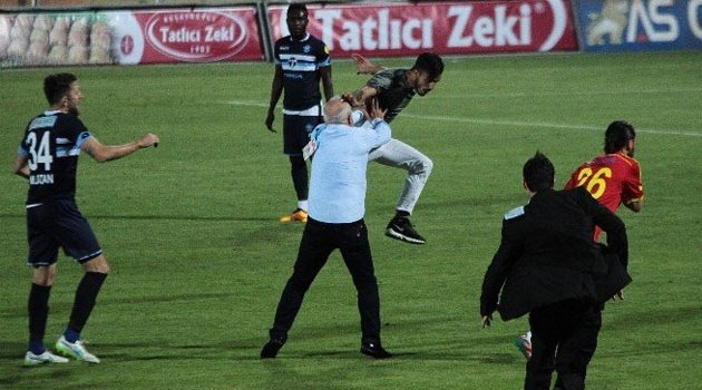 Bu sırada bir Adana Demirsporlu bir taraftar, sahaya atlayarak Alima Yeni Malatyaspor oyuncusu Hüseyin Kar’ın üstüne koştu. Öfkeli taraftar, oyuncu ile kendisini arasına giren Adana Demirspor Kulüp Müdürü Mustafa Türk’e uçak tekme attı. Güvenlik görevlileri taraftarı yere yatırarak etkisiz hale getirirken, taraftar gözaltına alındı.