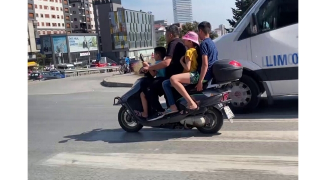 Seyir halindeki bir motosiklet üzerindeki 3'ü çocuk olmak üzere 4 kişi tehlikeli şekilde yolculuk yaptı. Kişilerin motosiklet üzerinde arka arkaya oturması ve kask takmamadan seyahat etmeleri ise felekate davetiye çıkardı. Bu manzaraya şahit olanların ise yürekleri ağzına gelirken, bu anlar cep telefonu kamerasına yanısıdı.
