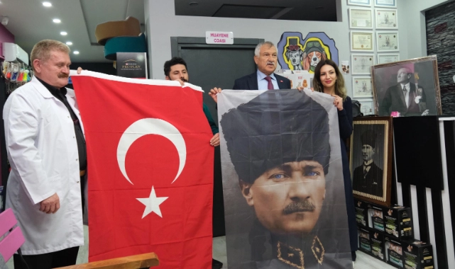 Başkan Zeydan Karalar, klinik sahibine ve çalışanlara Atatürk tablosu, Atatürk flaması ve Türk Bayrağı hediye etti.