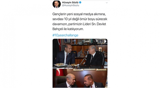 Sosyal medya kullanıcıların yoğun ilgisi ile büyük bir akım haline gelen ‘10 years challenge’ ye kayıtsız kalmayan Başkan Sözlü, “Gençlerin yeni sosyal medya akımına, sevdası 10 yıl değil ömür boyu sürecek davamızın, partimizin Lideri Sn. Devlet Bahçeli ile katılıyorum” yorumuyla MHP Lideri Devlet Bahçeli ile 10 yıl önce Ceyhan Belediye Başkanlığı dönemindeki fotoğraf ile Adana Büyükşehir Belediye Başkanlığı dönemindeki fotoğrafları paylaştı.