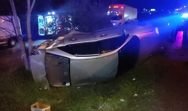 Çarpmanın şiddetiyle öndeki otomobil savruldu ve yoldan çıkıp ağaçlara çarparak takla attı.