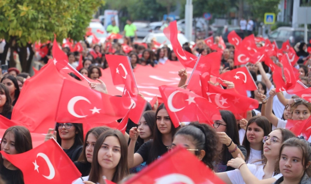 Daha sonra öğrenciler, açtıkları 100 metre uzunluğundaki Türk bayrağı ile Süleyman Demirel Bulvarı'nda marşlar eşliğinde yürüyüş gerçekleştirdi.