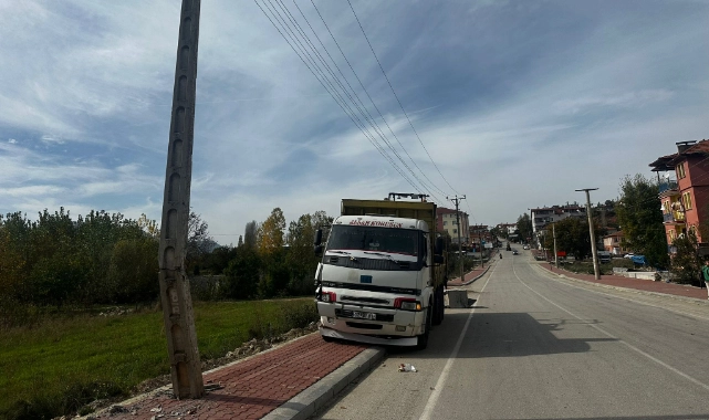 Isparta'nın Aksu ilçesinde freni boşalan kamyon direğe çarparak durabildi.