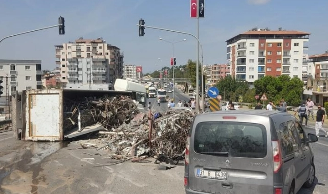 F.Ö. idaresindeki 06 CLH 806 plakalı hurda inşaat demiri yüklü tır, Antakya-İskenderun kara yolunda, sürücüsünün direksiyon hakimiyetini kaybetmesi sonucu karşı şeride geçerek devrildi.