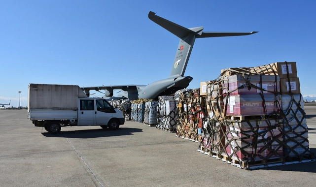 Çadır, yatak, battaniye, yorgan, yastık, jeneratör ve ısıtıcılar ile gıda malzemelerinin olduğu paketler, İncirlik 10. Tanker Üs Komutanlığı'nda oluşturulan "hava yardım koridoru" ile depremzedelere ulaştırılması için askeri uçak ve helikopterlere yükleniyor.