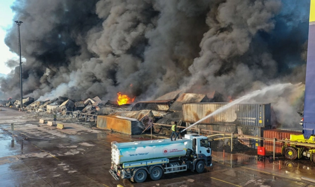 Merkez üssü Kahramanmaraş'ın Pazarcık ve Elbistan ilçeleri olan ve 10 ili etkileyen 7,7 ve 7,6 büyüklüğündeki depremler sonrasında limanda devrilen konteynerlerde henüz belirlenemeyen nedenle çıkan yangın sürüyor.