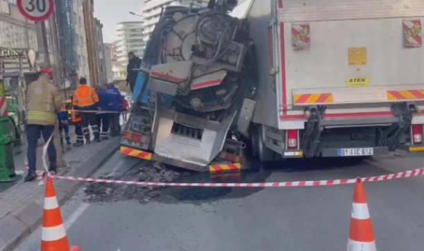 Öte yandan çökme sırasında yoldan geçen bir kamyon da İSKİ aracının yan yatması nedeniyle hasar aldı.