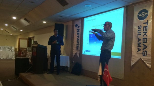 Seminerin konuşmacısı İsrailli agronomist (bilimsel tarım uzmanı) Prof. Dr. Eli Matan, slayt eşliğinde çitçilere damla sulama ve vahşi sulama arasındaki verim farklılığını anlattı.