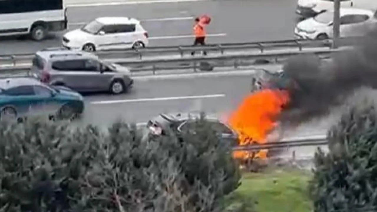 TEM Hadımköy Bağlantı Yolu Esenyurt mevkiinde, BMW marka bir aracın motor kısmında başlayan yangın, dakikalar içinde aracı küle çevirdi. Alev topuna dönen araç ise itfaiye ekiplerince söndürülürken, yaşanan o anlar kameraya yansıdı.