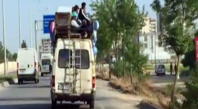 Çevredeki sürücü ve vatandaşları ilk gördüğünde gülümseten görüntülerde, aracın tepesinde eşyalarla birlikte yolculuk eden 4 kişi yürekleri ağza getirdi.