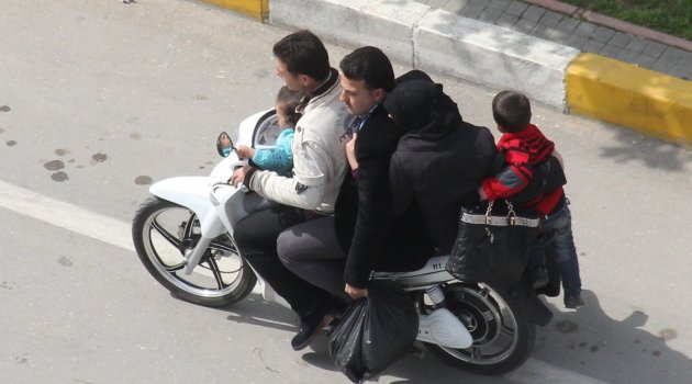 Motosiklete binen 5 kişinin de kaskı olmaması da dikkat çekti. Çocuklardan biri sürücünün önüne oturtulurken diğer çocuk annesinin kucağında adeta askıda havada gittiği görüldü. Motosikletin en küçük bir çukura düşmesi durumunda çocuğun yere düşüp yoldan geçen otomobillerin altında kalma tehlikesi olması annesinin umurunda bile olmadı.