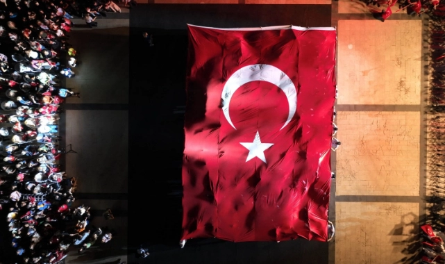 “100.Yıl Marşı” ve alkışlar eşliğinde açılan dev Türk Bayrağı ile Cumhuriyet coşkusu doruk noktaya ulaştı.
