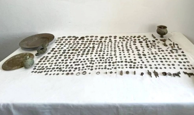 Operasyonla gözaltına alınan şüphelinin ev ve iş yerinde, 785 sikke ve 32 obje bulundu.