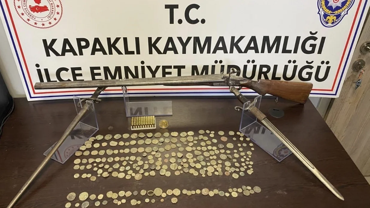 Tekirdağ İl Emniyet Müdürlüğü görevlilerince tarihi eser kaçakçılığı faaliyetlerine karşı Kapaklı ilçesinde yapılan çalışmalarda; 256 adet obje ve madeni para, 2 adet Osmanlı merasim süngüsü, 1 adet çakmaklı tüfek, 1 adet yüzük objesi ve 50 adet tabanca fişeği ele geçirilmiştir.
