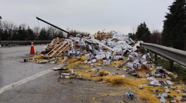 Alınan bilgiye göre, 63 ABR 957 plakalı Mahmut Ç. idaresindeki bakliyat yüklü tır, seyir halindeyken karayollarına ait M.G. idaresindeki tuzlama aracına çarptı. Mahmut Ç. çarpışmanın etkisiyle devrilen yaralanırken, tır dorsesinde yüklü tonlarca bakliyat ve makarna TEM Otoyoluna saçıldı. Kazayı görenlerin ihbarı üzerine olay yerine 112 Acil Yardım ekipleri sevk edildi.Kısa sürede olay yerine gelen sağlık ekiplerince ilk müdahalesi yapılan Mahmut Ç., ambulansla Devlet Hastanesine kaldırıldı. Çarpışmanın etkisiyle yola saçılan tonlarca bakliyat ve makarna, karayolları ekiplerince yol kenarına alındı. Tedbir amacıyla tek şeritten kontrollü sağlanan trafik, tırın çekici ile kaldırılması ve yolun temizlenmesi ile normale döndü.