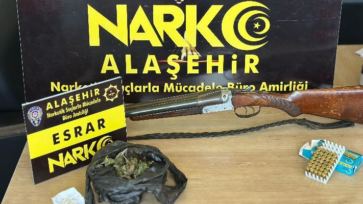 Manisa İl Emniyet Müdürlüğü Narkotik Suçlarla Mücadele Şube Müdürlüğü ve Alaşehir Narkotik Büro Amirliği ekipleri tarafından yapılan çalışmada, şüphelinin üzerinde ve adresinde yapılan aramalarda 1,5 gram metamfetamin, 51 adet sentetik ecza hapı, 2 parça halinde 50,18 gram esrar maddesi, 35 adet 9x19 mm çapında mermi ve 1 adet av tüfeği ele geçirildi.