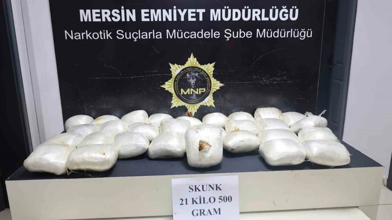Mersin İl Emniyet Müdürlüğü Narkotik Suçlarla Mücadele Şube Müdürlüğü ekiplerince yürütülen çalışma sonucu uyuşturucu madde sevkiyatına yönelik operasyon düzenlendi. Operasyonda yakıt tankerinde yapılan aramada, zulalanmış halde toplam 21,5 kilogram skunk ele geçirildi.